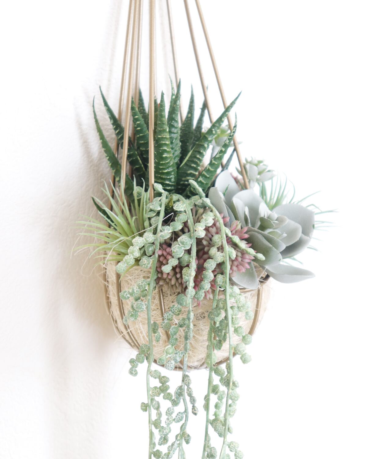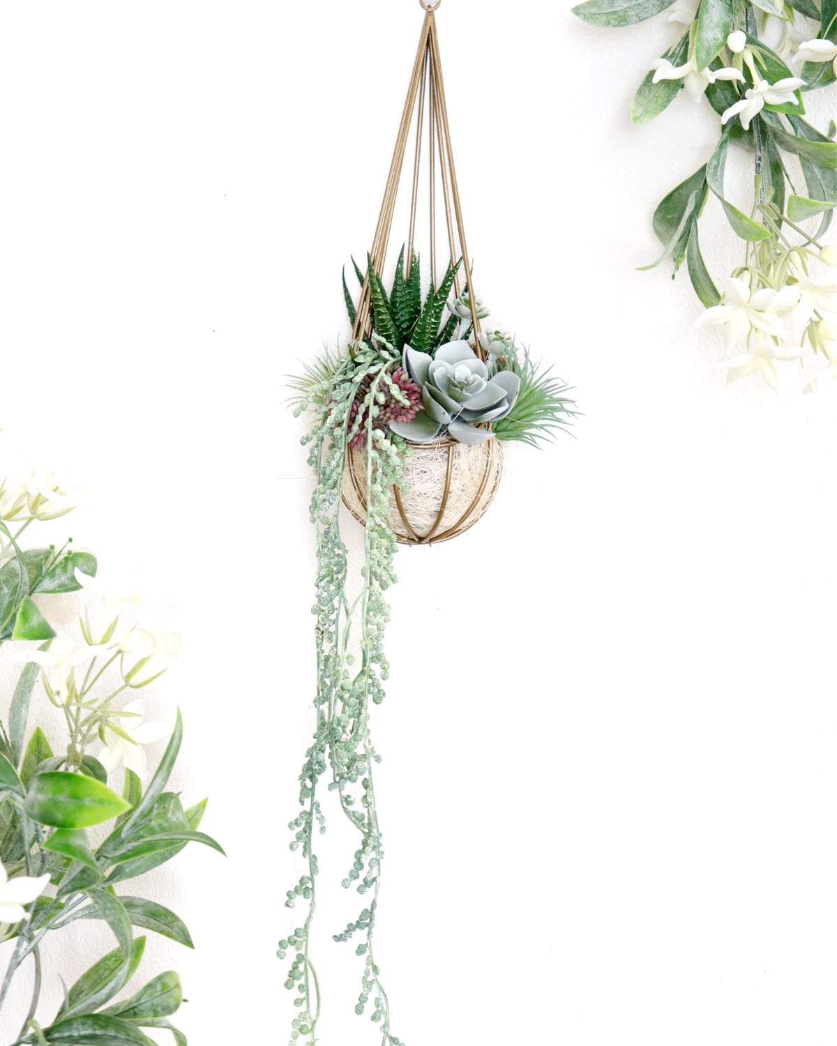 多肉植物・エアプランツのアーティフィシャルフラワーでハンギングアレンジをお部屋のアクセントグリーンにしてみましょう。