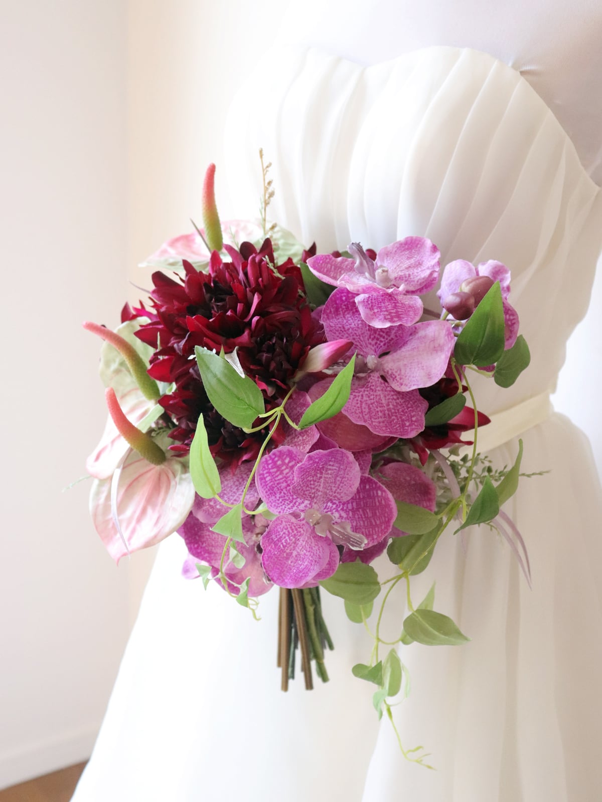 深紅のダリアと紫のバンダラン、絶妙なグラデーションのアンスリュームを束ねたモダンで華やかなクラッチブーケです
