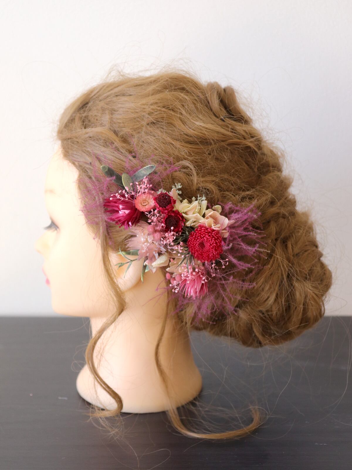 ドライフラワーやプリザーブドフラワーの人気花材をカラフルに取り揃えて、ヘッドパーツにしました。