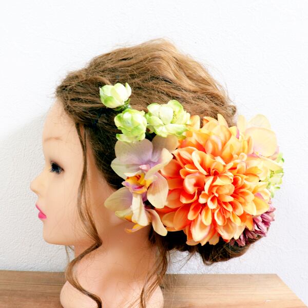 【アーティフィシャル】成人式・卒業式・結婚式和装の髪飾りに。オレンジのダリア・マム・蘭のヘッドドレス