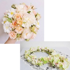 こちらのお品物は、ブーケ&ブートニア、花冠、リストレットのセットで、1点ものとなります。